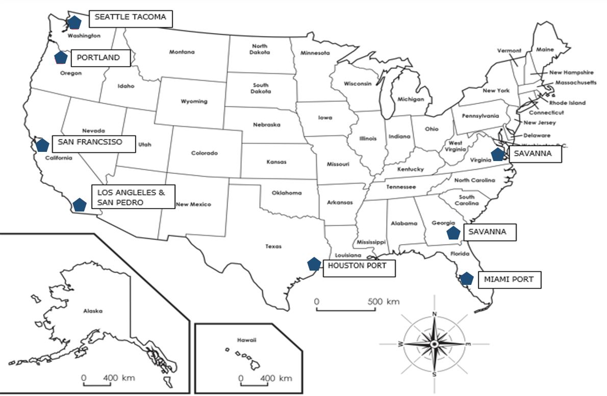 บริษัทฯมีศูนย์บริการรับพัสดุสินค้า (Hub Station) อยู่ถึง 25 แห่งในสหรัฐฯ เมื่อได้รับพัสดุสินค้าจาก Exporter ต่างๆ ที่มีสำนักงานอยู่ใกล้เคียงกับศูนย์รับของของบริษัทฯ ดูรายชื่อศูนย์รับของ City/States and Sailing Port พร้อมกับระยะการเดินทางจาก Port  นั้นๆถึงลาดกระบัง